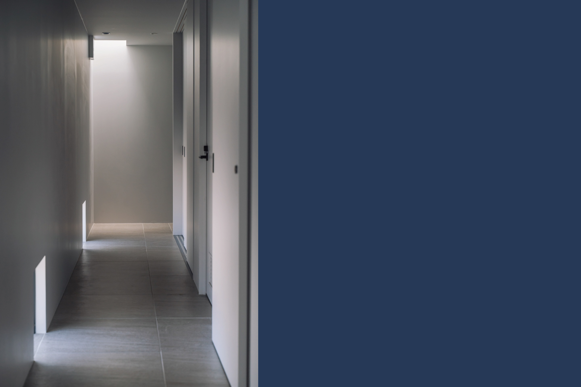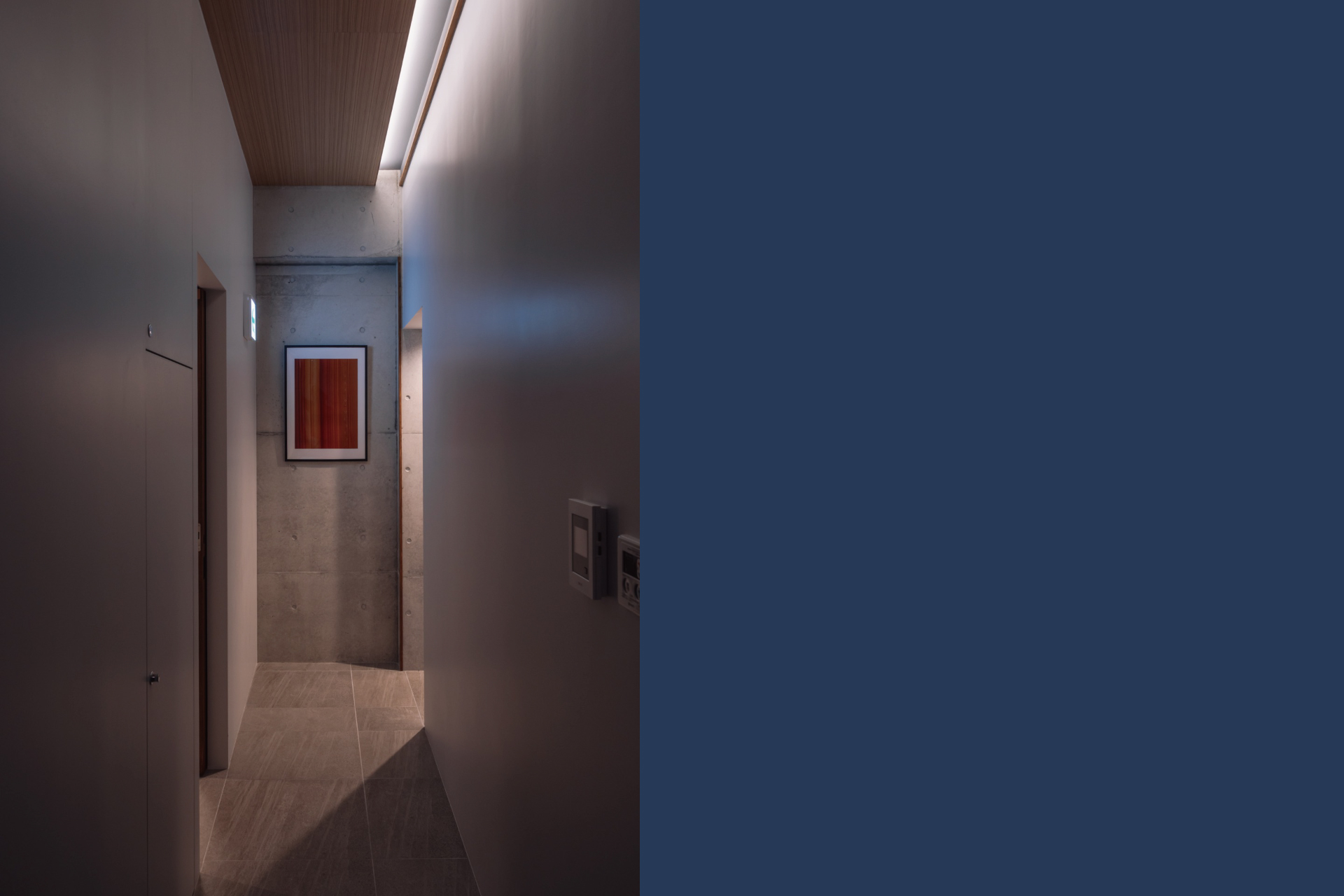石調タイルが落ち着いたグレートーンの廊下。間接照明の陰影が心地よい