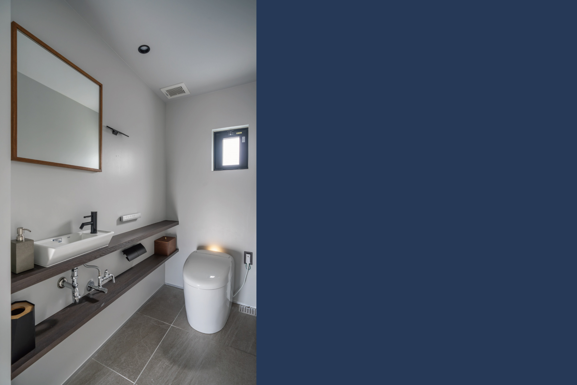 洗面室は洗面ボールとワイドミラーの設置で、複数利用に対応する