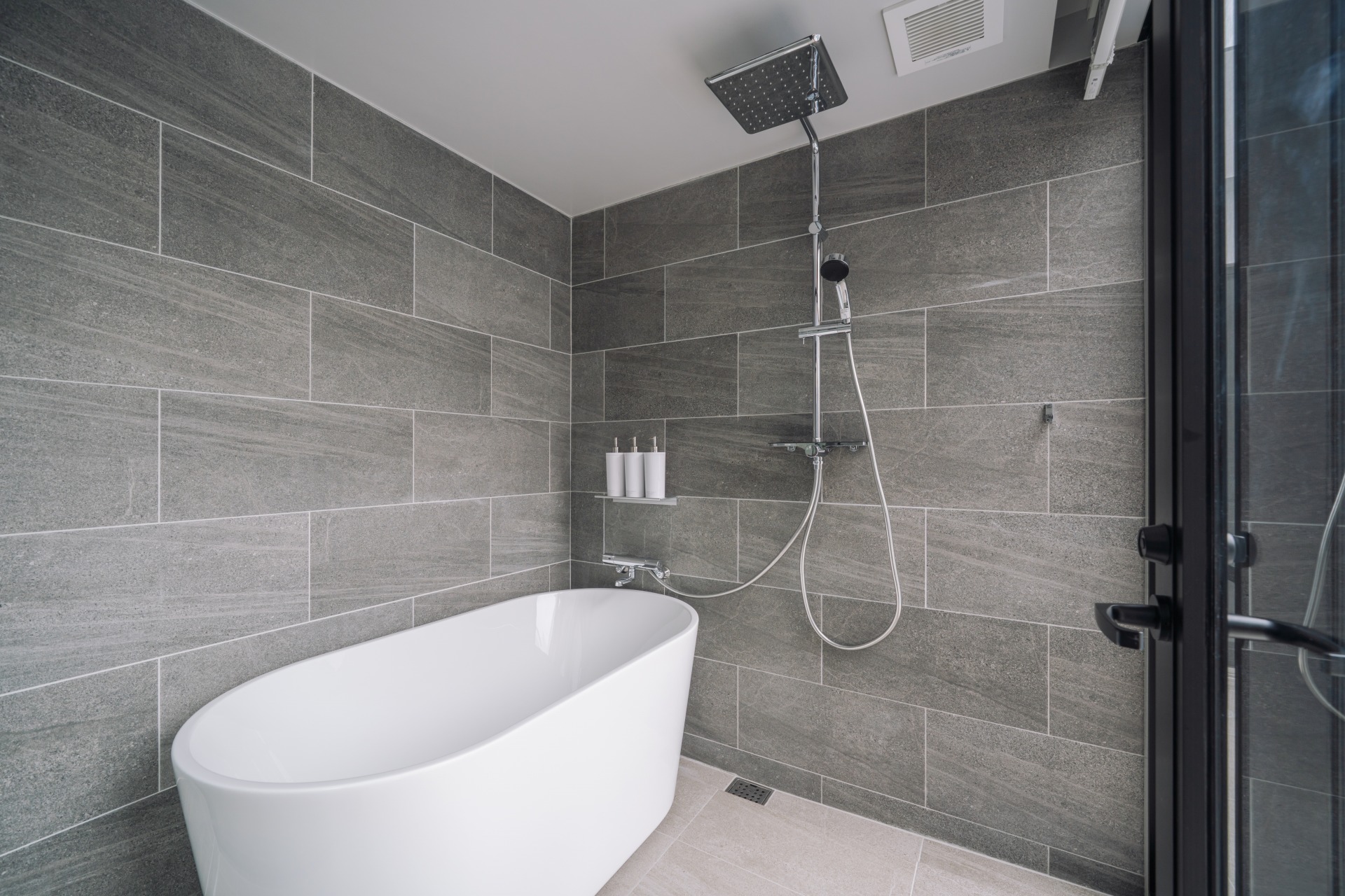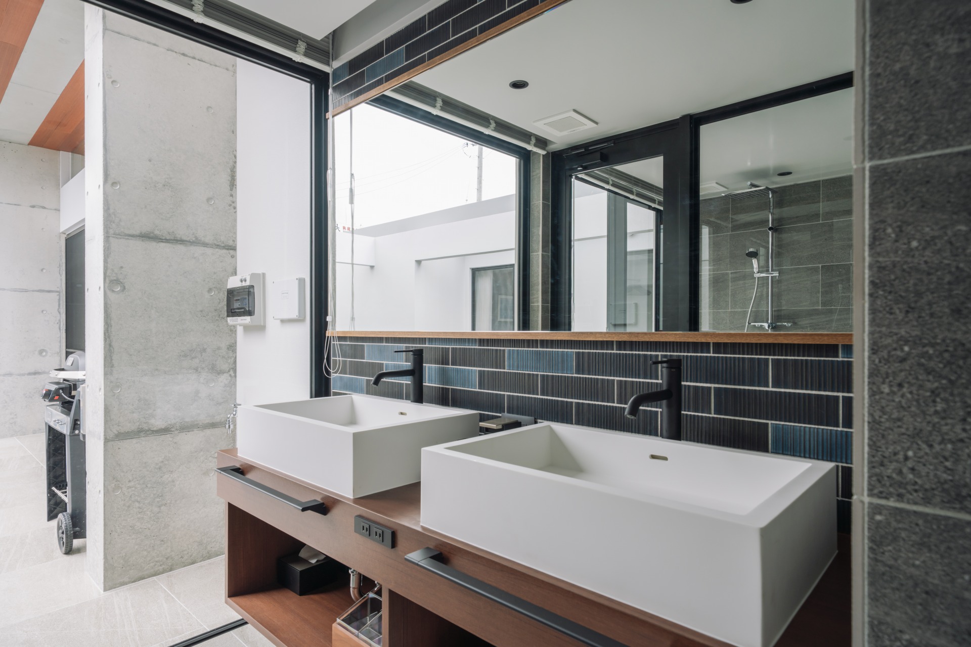 レインシャワーを施した浴室は、洗面室とテラスから続く配置