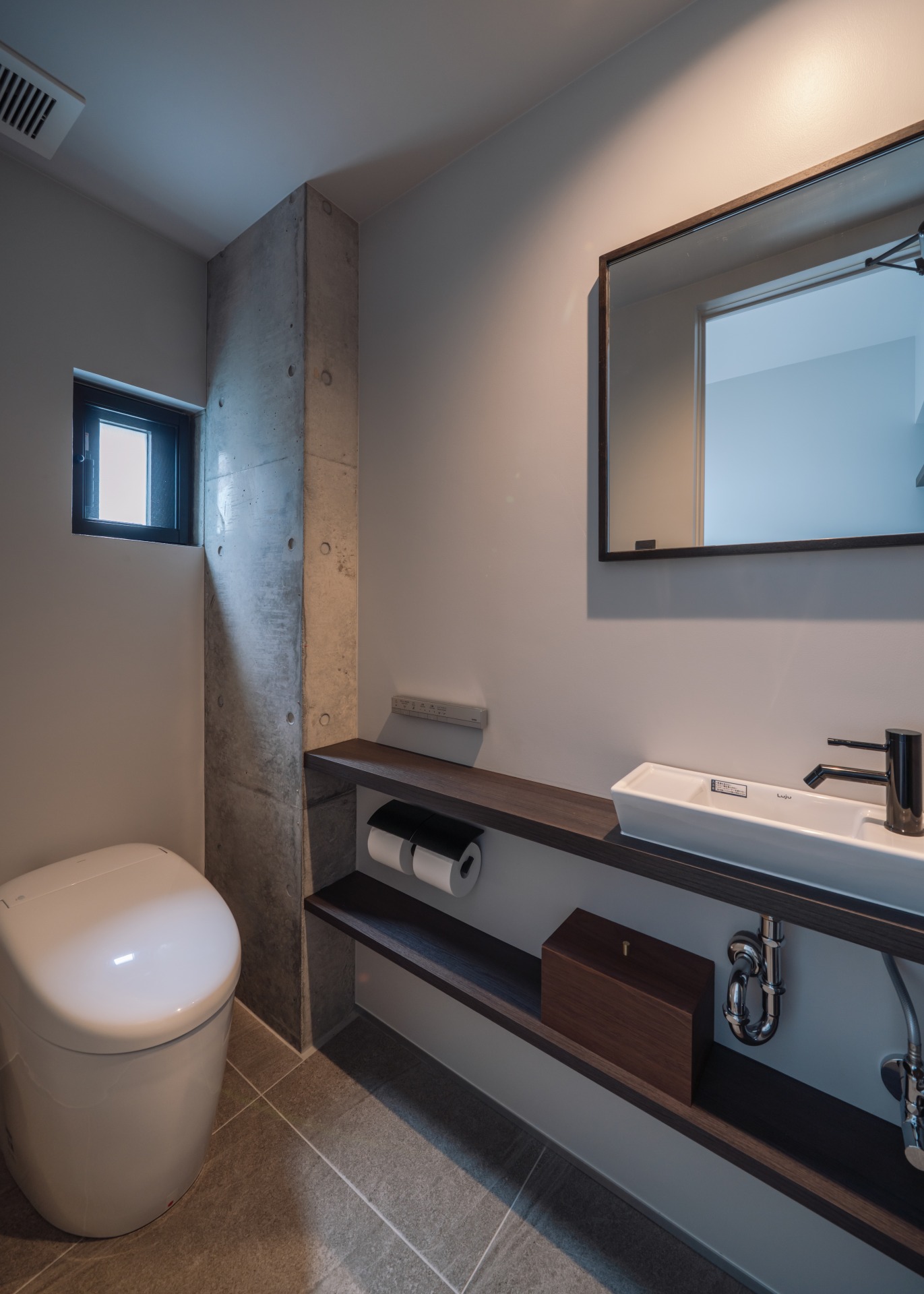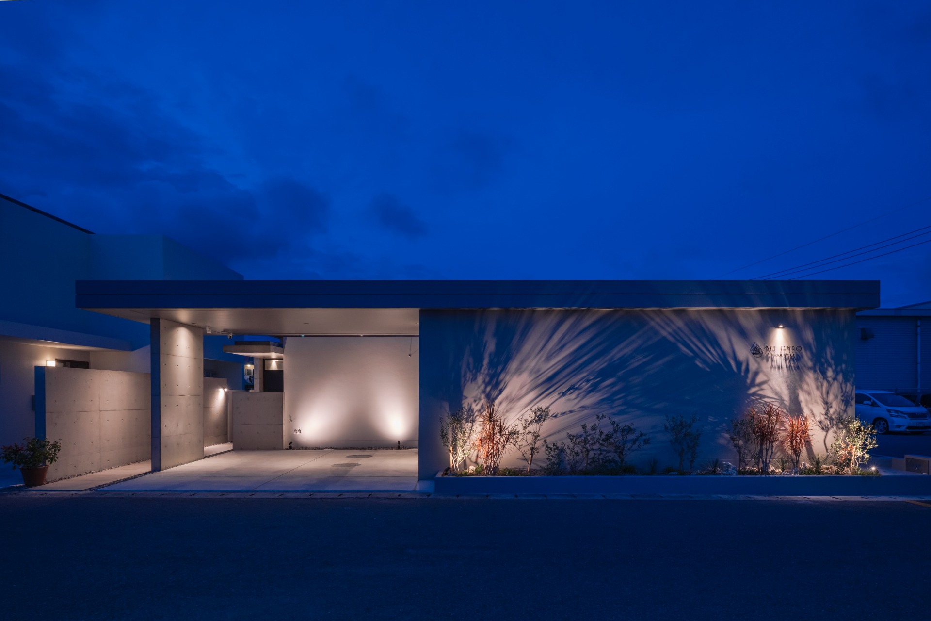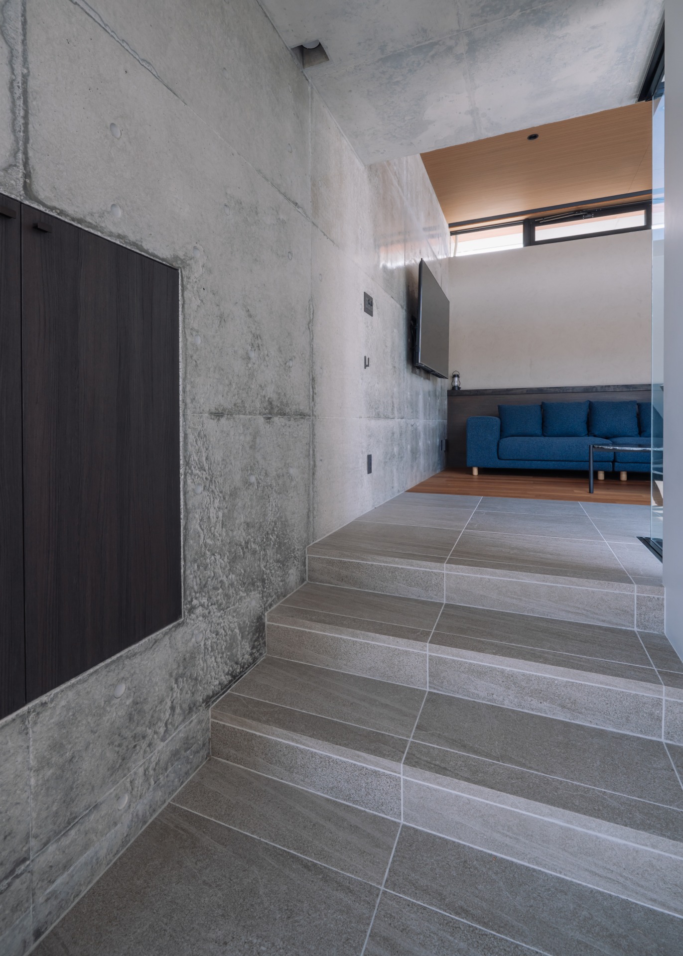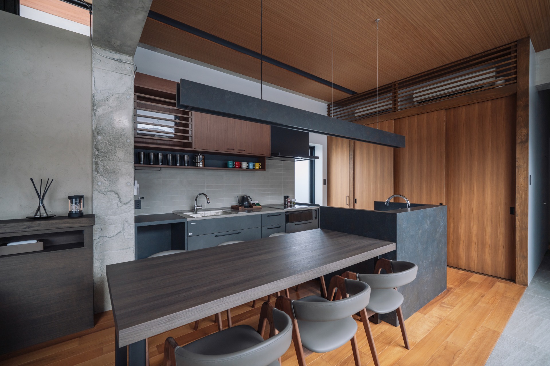 コンクリートと木の素材が織りなす陰影が、時間とともに変化していく。