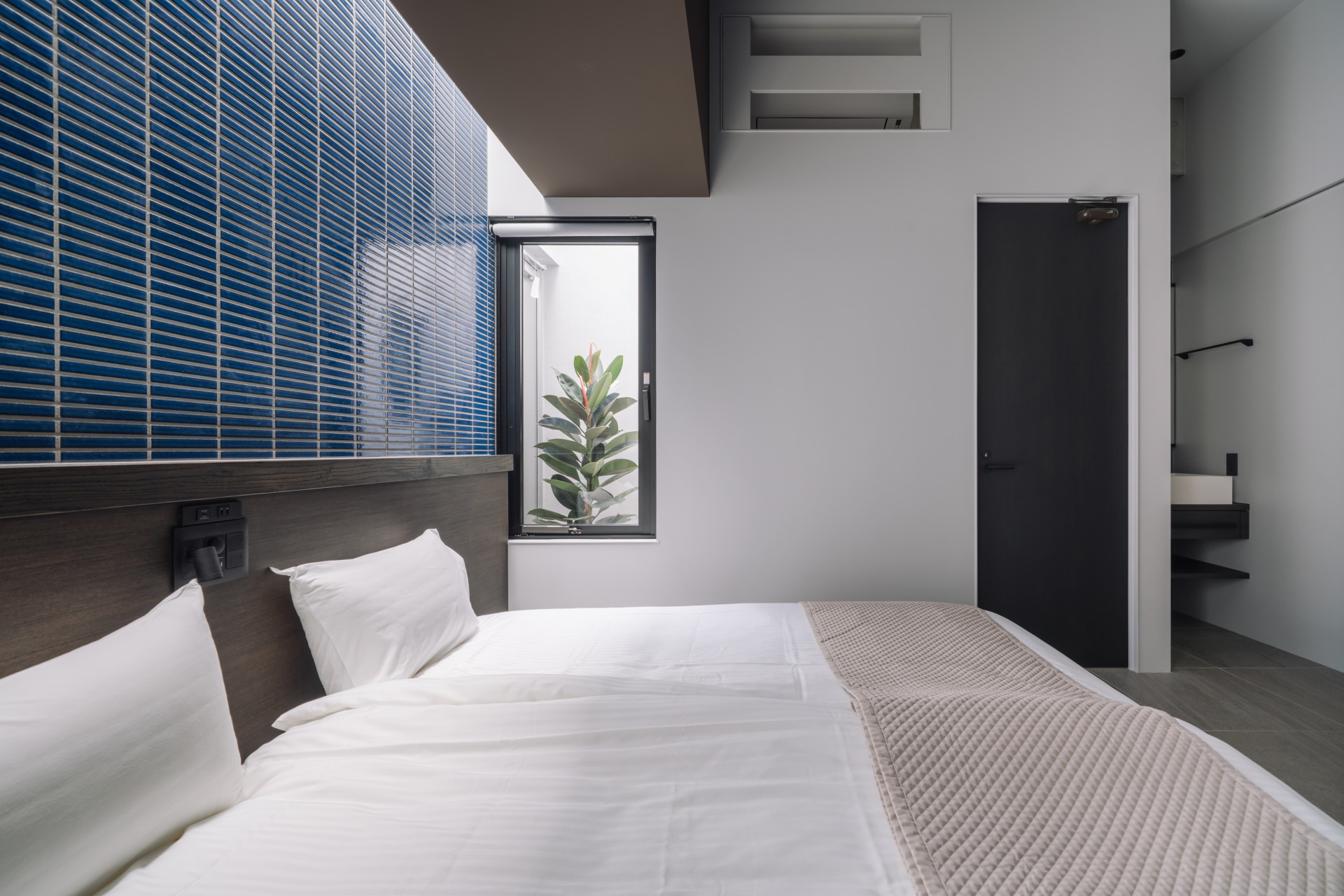 ベッドルームの素材に木目を取入れ、無機質になり過ぎないデザイン