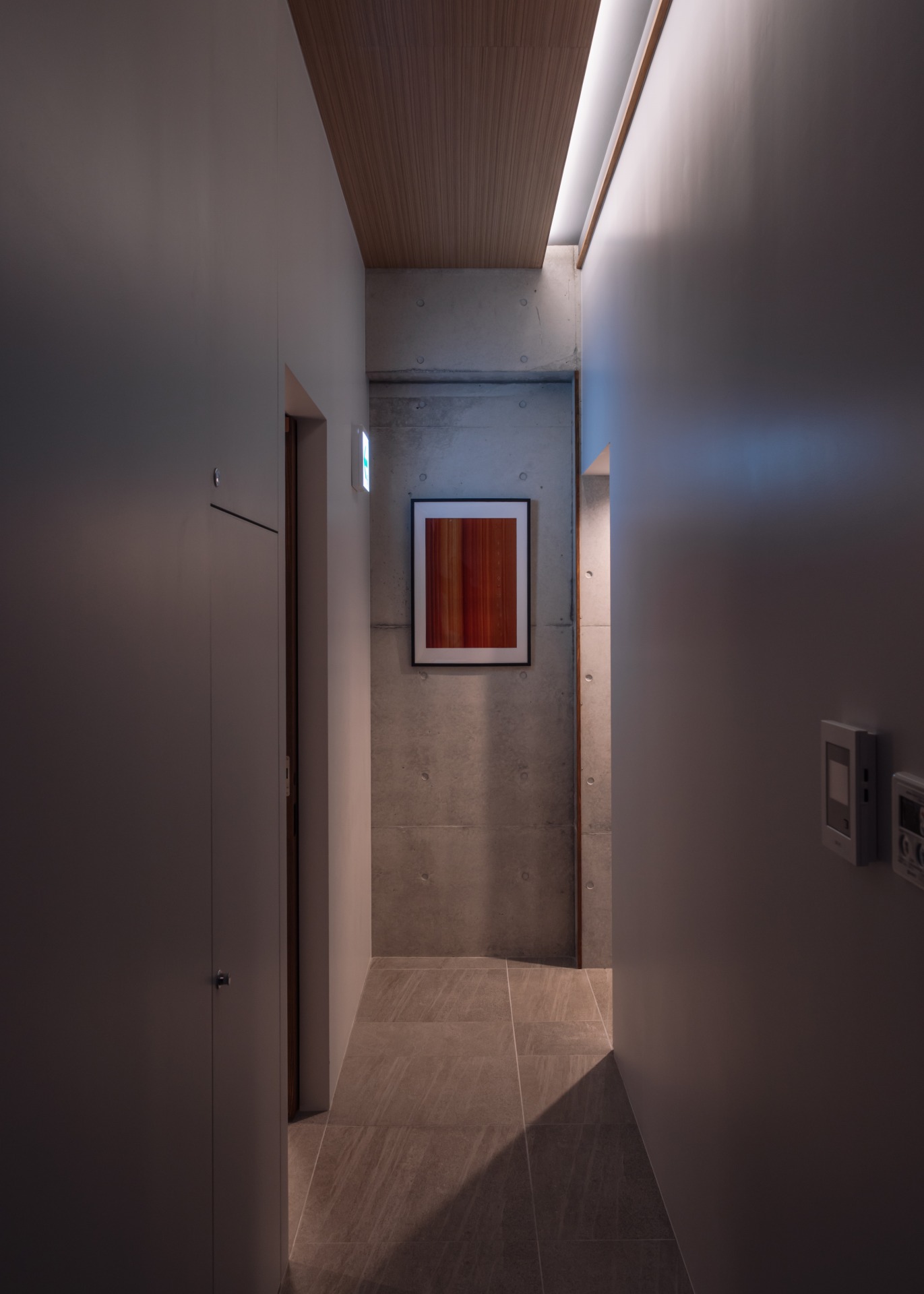 石調タイルが落ち着いたグレートーンの廊下。間接照明の陰影が心地よい