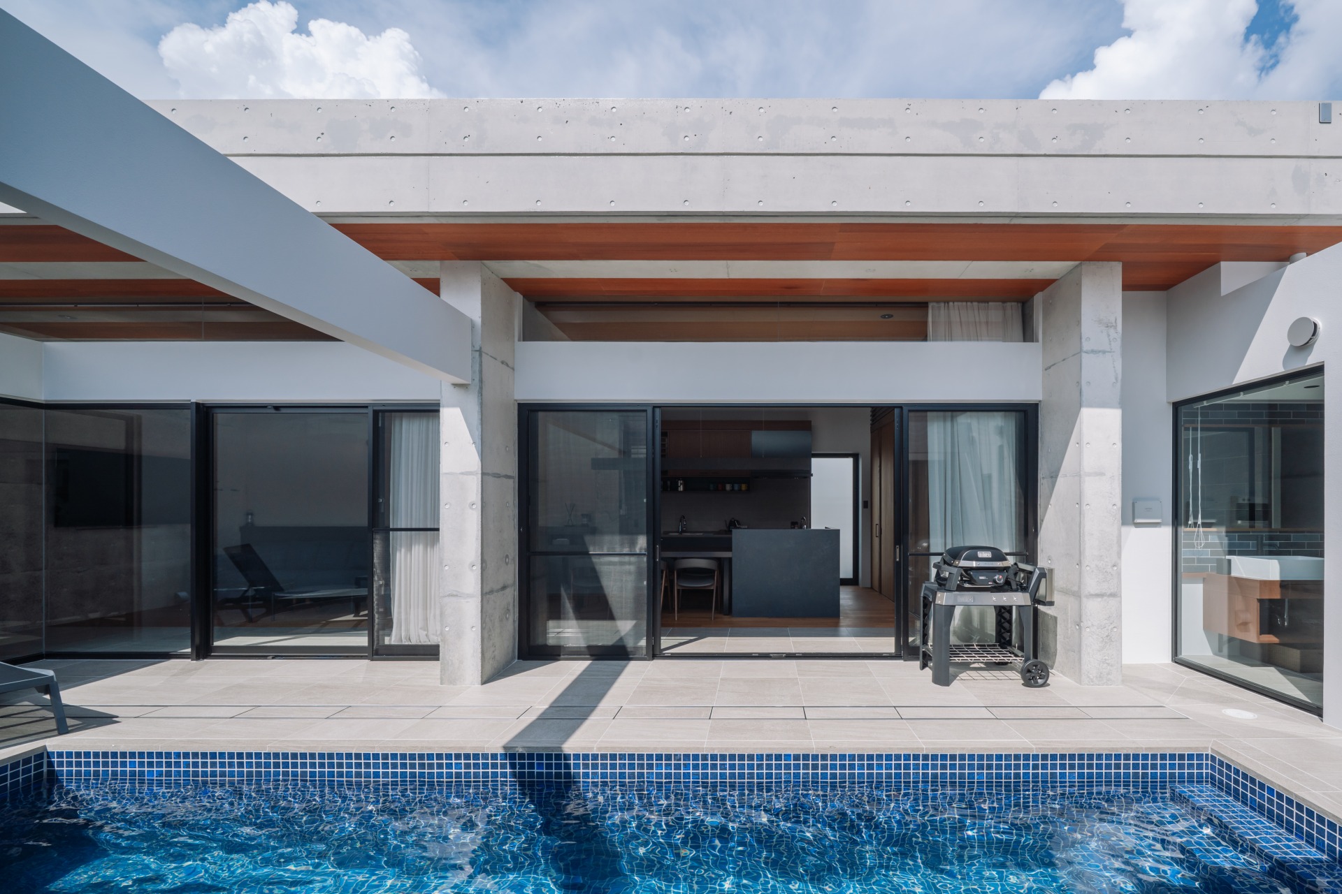 プールに近い廊下はテラスと同色のタイル貼りとしている