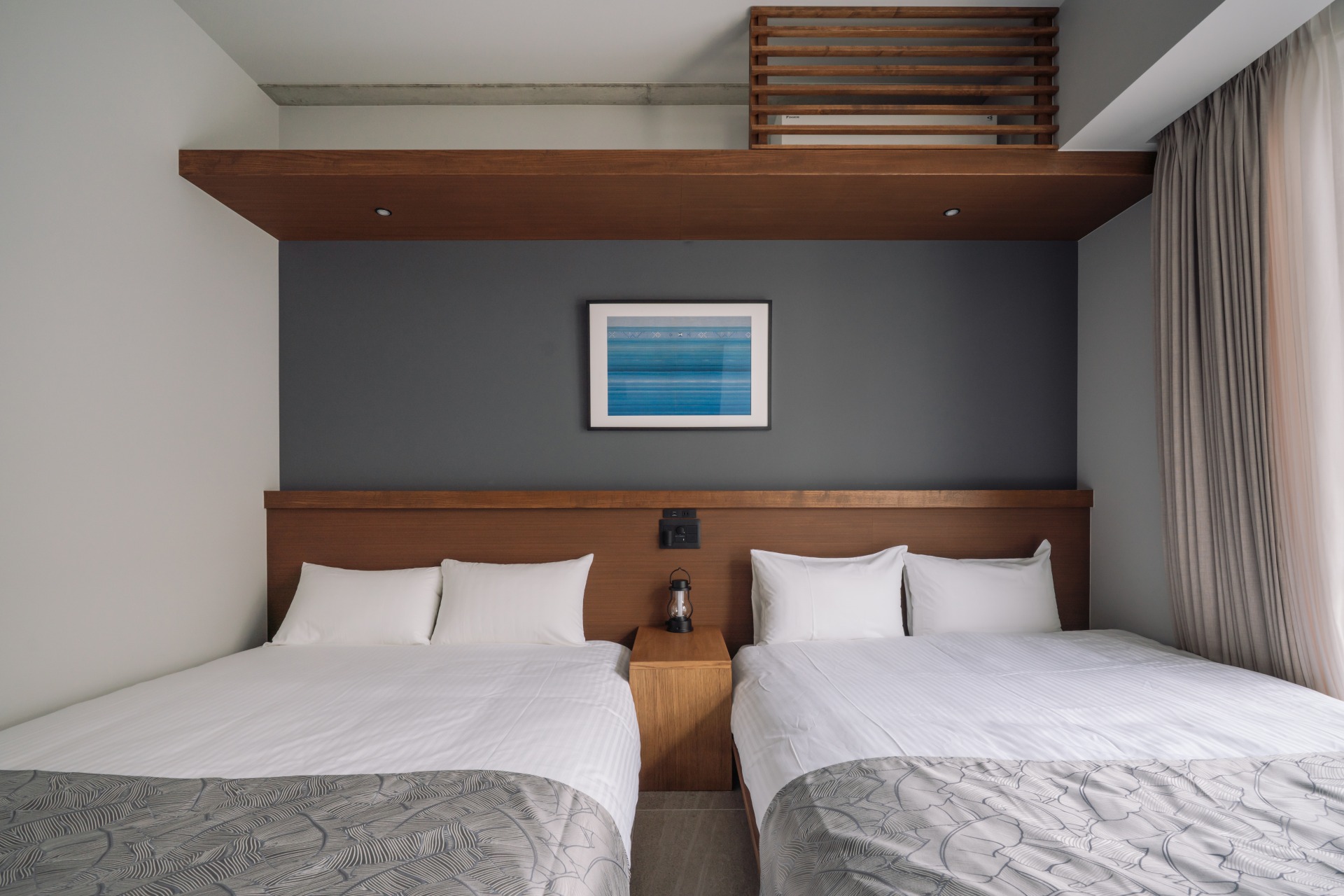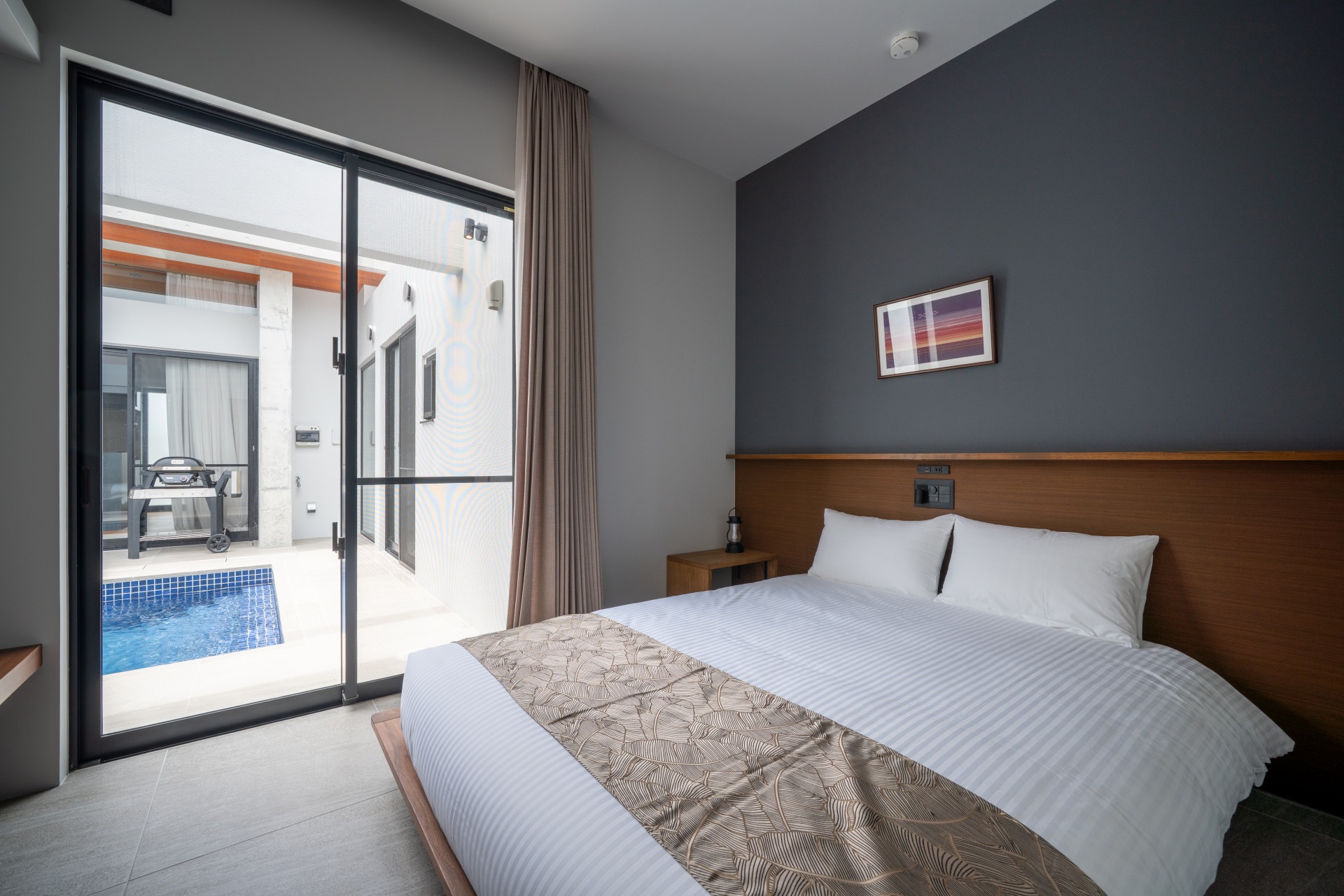 木の質感とグレーの壁が上品な雰囲気の寝室