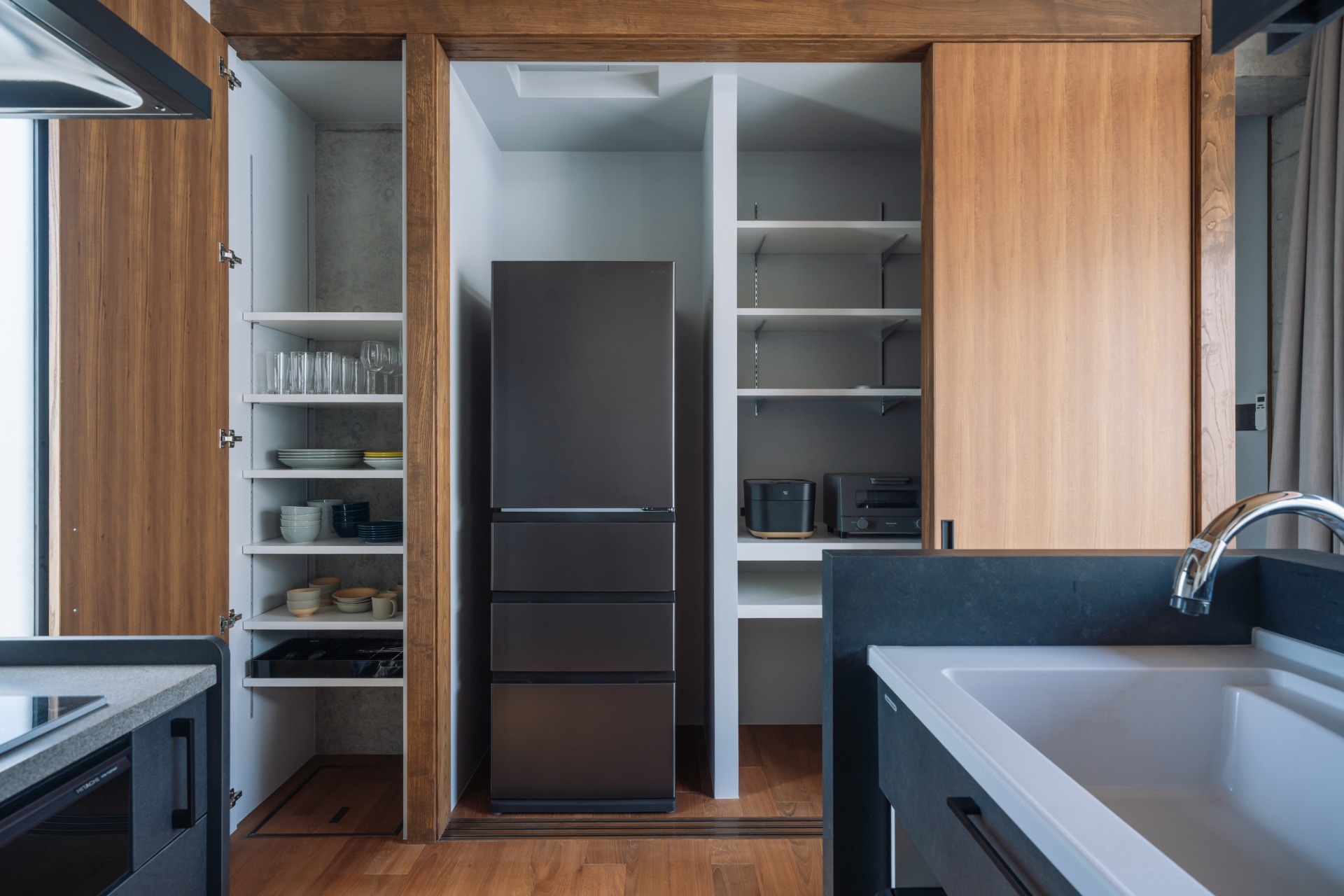 キッチンエリアは、BBQ時やパーティー時に対応可能な対面シンクも配置している