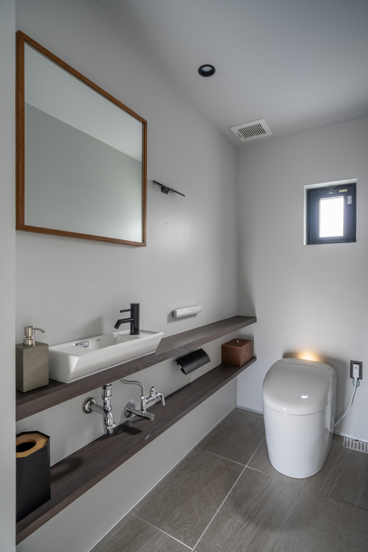 洗面室は洗面ボールとワイドミラーの設置で、複数利用に対応する