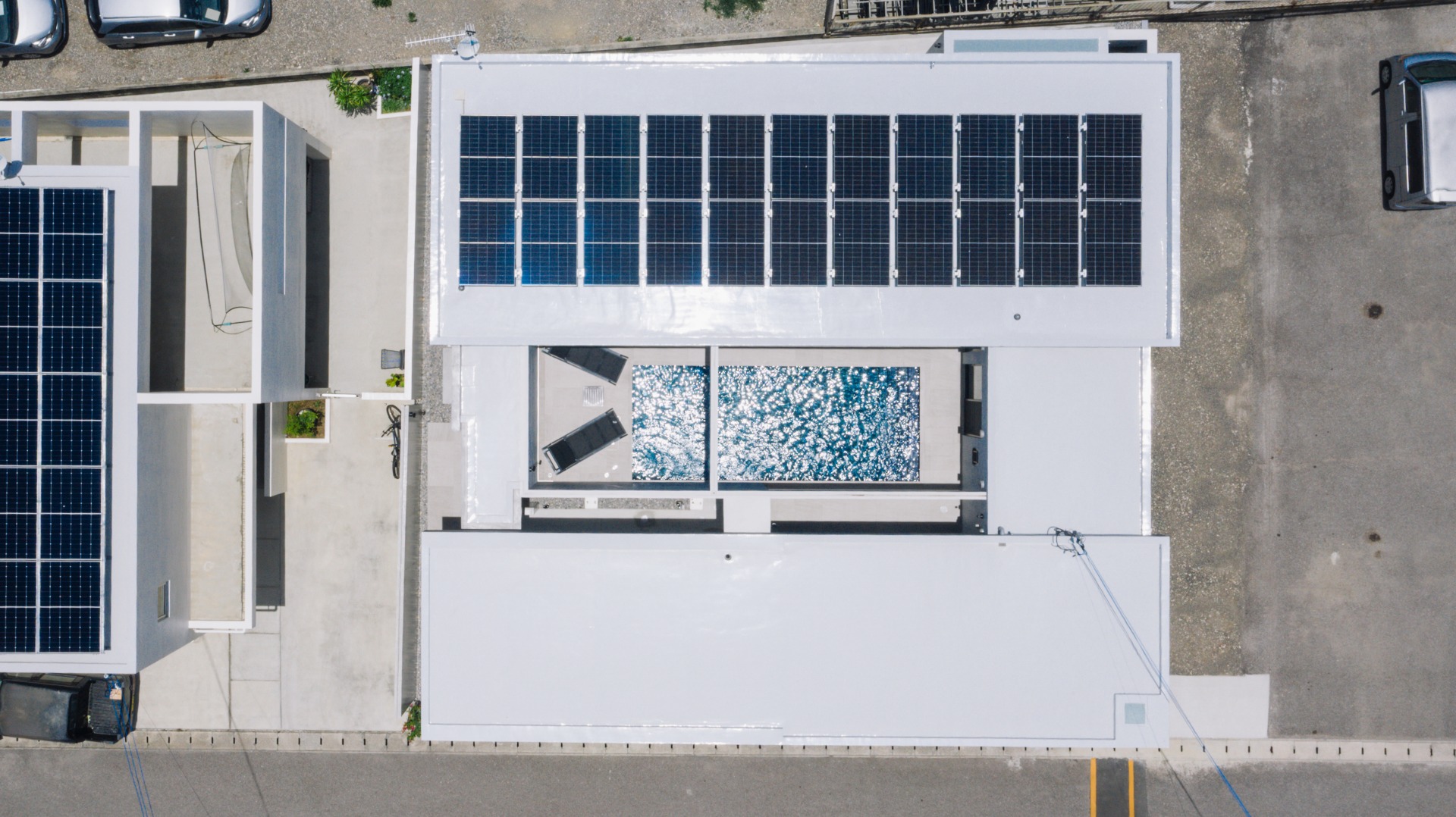 空撮。プライベートプール・テラスを囲むデザイン